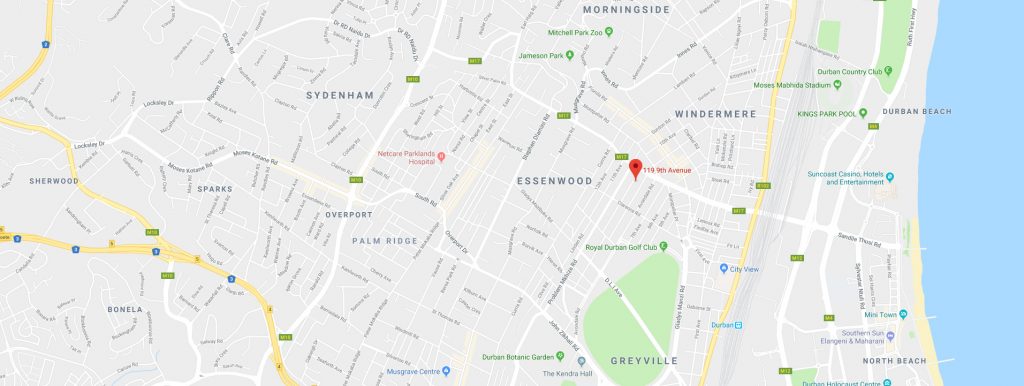 Follow the signs direction Durban and N2 North. Keep left direction Kwa Dukuza, Pietermaritzburg, N2 North +/- 10 km at big intersection follow signs to Durban City As you enter Durban keep in the middle lane. Take the Ridge Road (Peter Mokaba) / Tollgate / Berea off ramp. (Semi-circle bridge) Cross over Ridge Road (Peter Mokaba) and continue direction of thecity, keep in left lane – this is Berea Road North (King Dinuzulu). Continue over Musgrave Road and turn left into Botanic Gardens Road. Pass The Botanical Gardens, changes to Problem Mkhize (Cowey) Road. Pass Bread Ahead Bakery & Woolworths Food store. Cross over Marriot Road and at the next traffic light turn right down Clarence Road. Second left is Ninth Avenue. We are on the left – no 119 Ninth Avenue (Silver steel car gates)